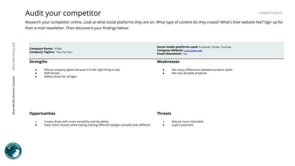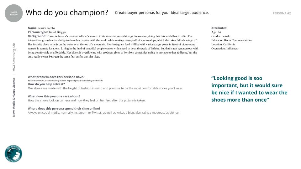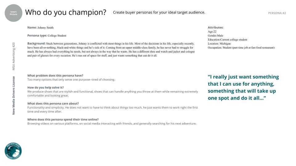 We plan to speak to these champions by using our brand voice of being sophisticated, active, and most importantly fun. Using these voices will help us to position our brands as one of innovation, adventure, and especially versatility. Finally, in an industry that is fairly saturated with brands, we are looking to Nike and TOMS as our top competitors, both of which have had an audit done on them so we can see where we need to improve so we can beat out sell our competition.